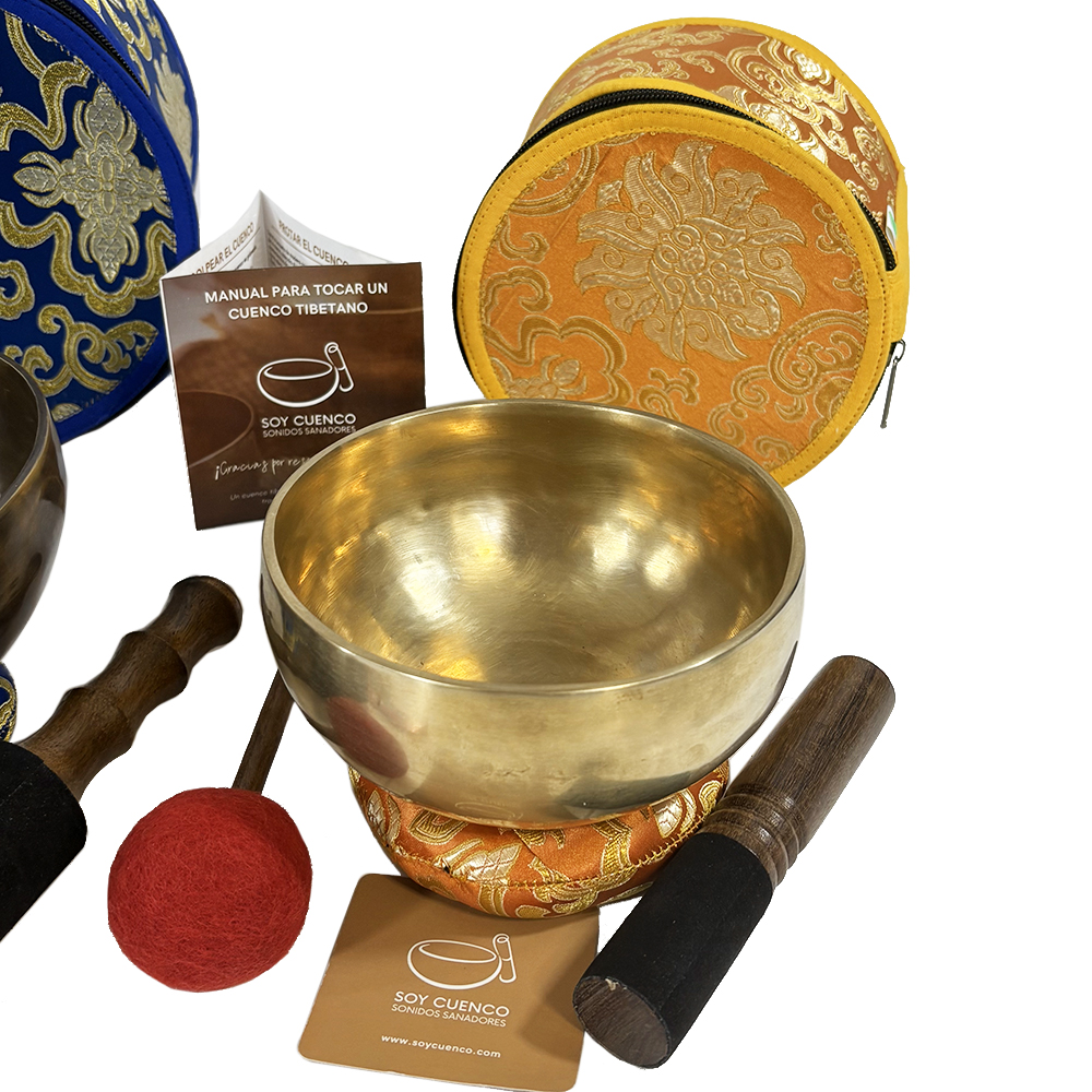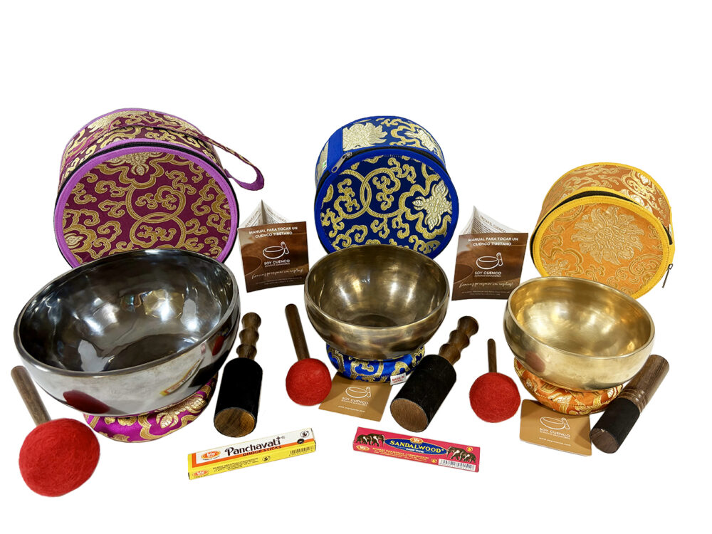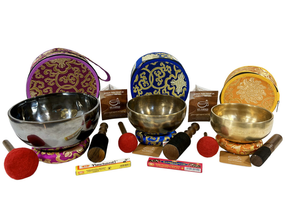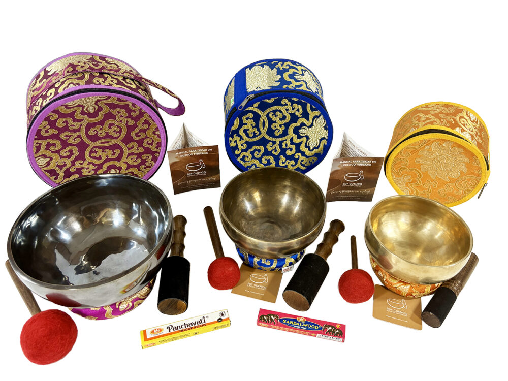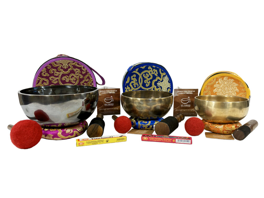 Este set incluye tres cuencos tibetanos clásicos artesanales con las siguientes medidas y acabados. Uno acabado en negro con diámetro de 21 cm. Su frecuencia sonora fundamental de 186 Hercios, otro de 17 cm de diámetro y de acabado tiger con una frecuencia sonora fundamental de 265 Hercios y un tercero de 15 cm de diámetro y acabado mate con frecuencia sonora fundamental de 378 Hercios.